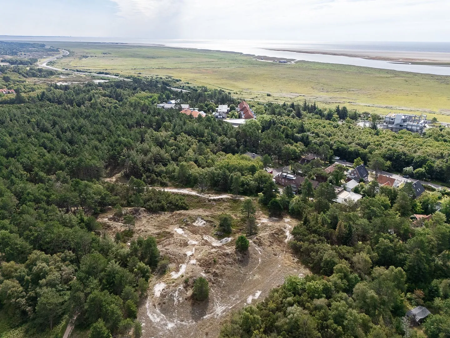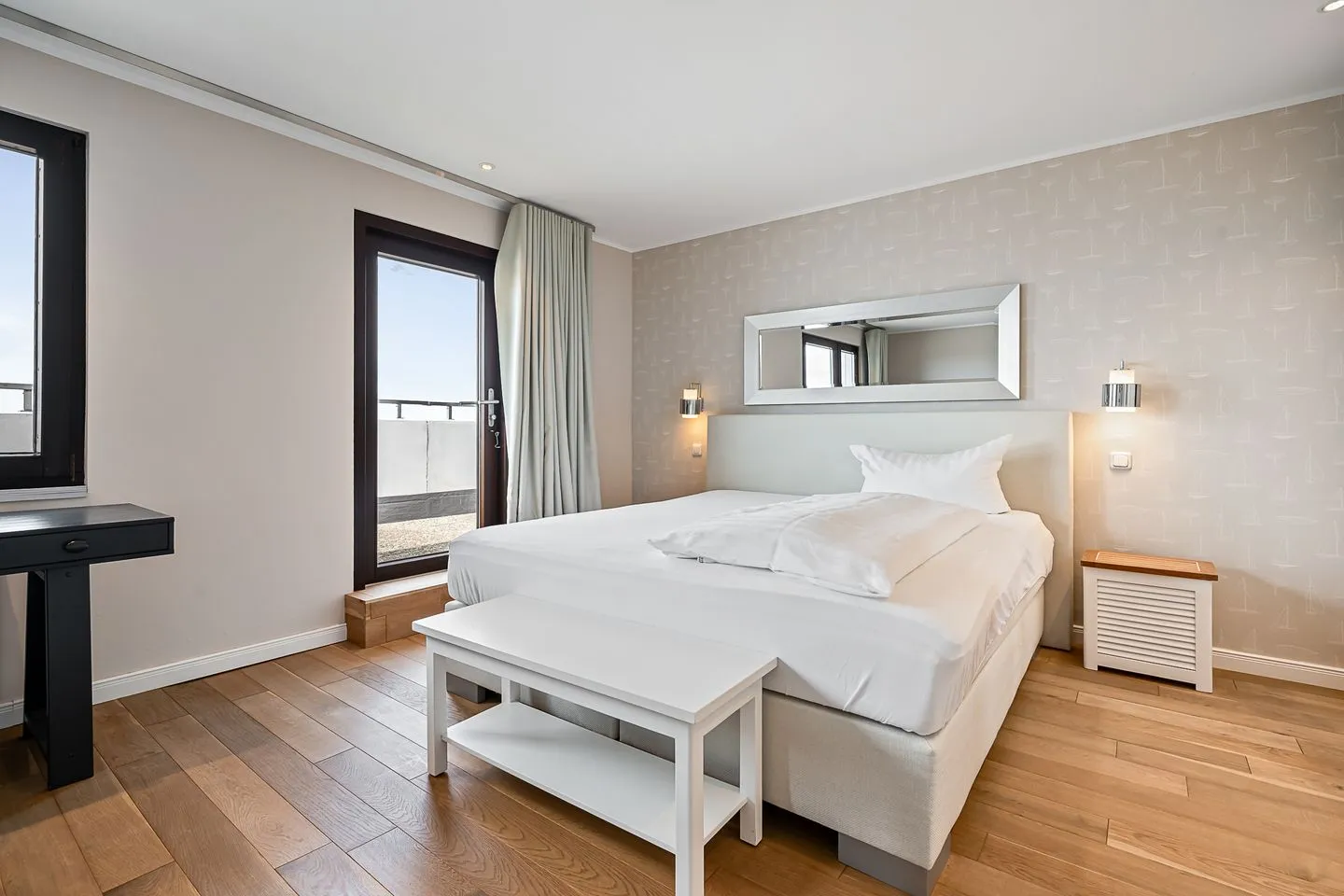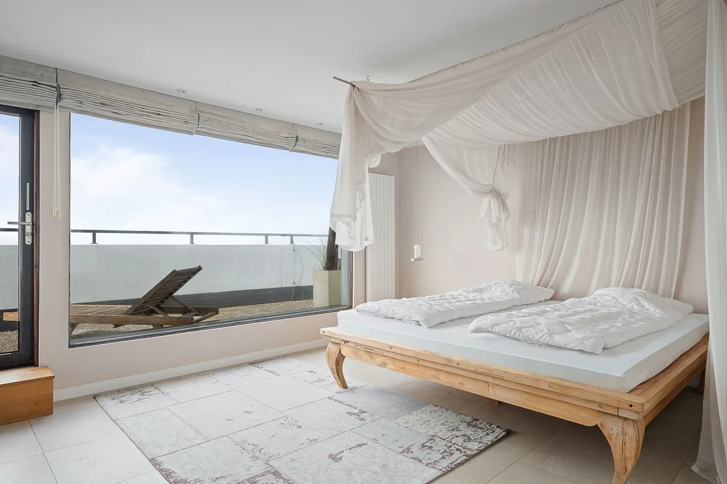Das geräumige Wohnzimmer des Penthouse verfügt über einen stilvollen Essbereich auf einem erhöhten Podest. Von hier aus erstreckt sich ein malerischer Blick auf den Strand und die endlose Nordsee – ein Ort der Entspannung und Erholung.