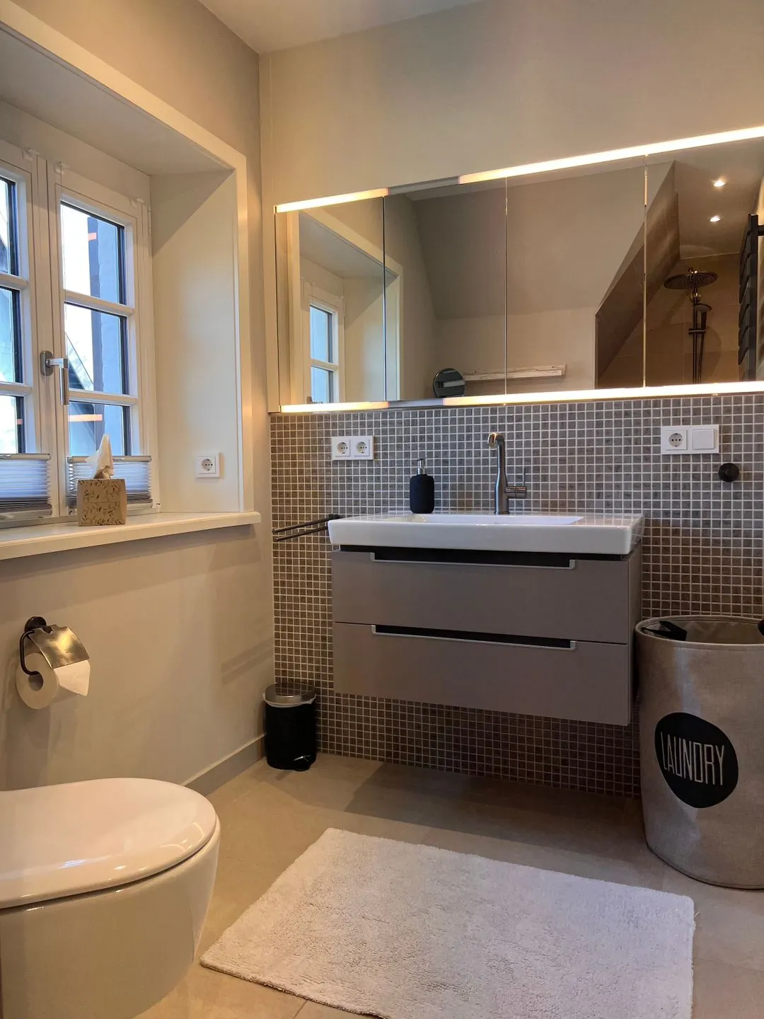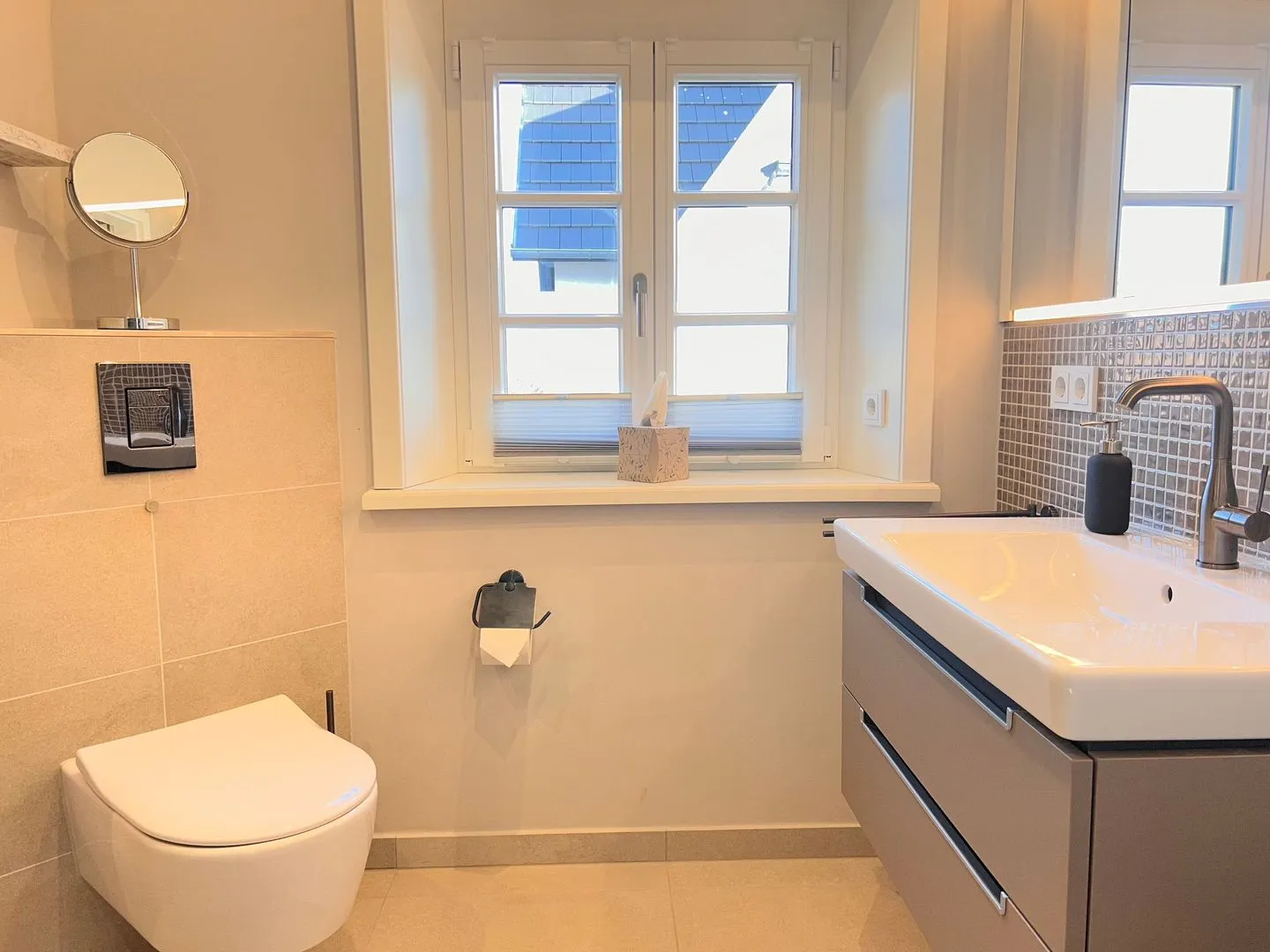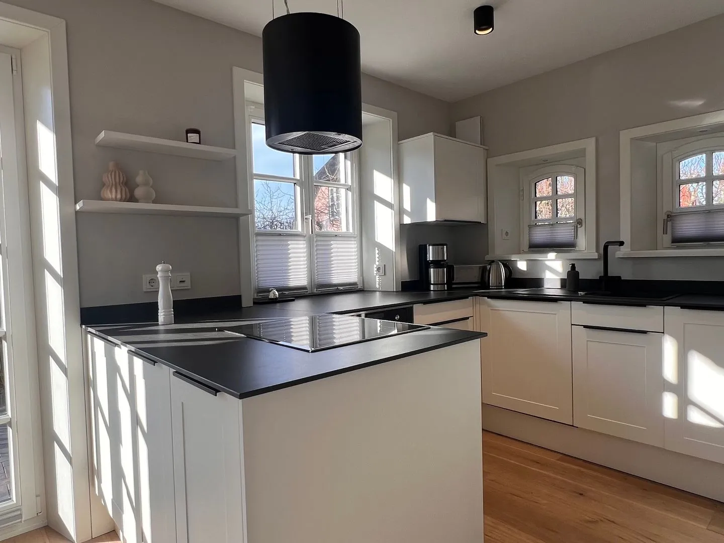 Im Erdgeschoss befindet sich der lichtdurchflutete Wohnraum mit TV, Gaskamin, einer offenen Küche sowie einem stilvollen Essbereich mit Terrassenzugang. Die Küche ist mit hochwertigen Elektrogeräten ausgestattet.