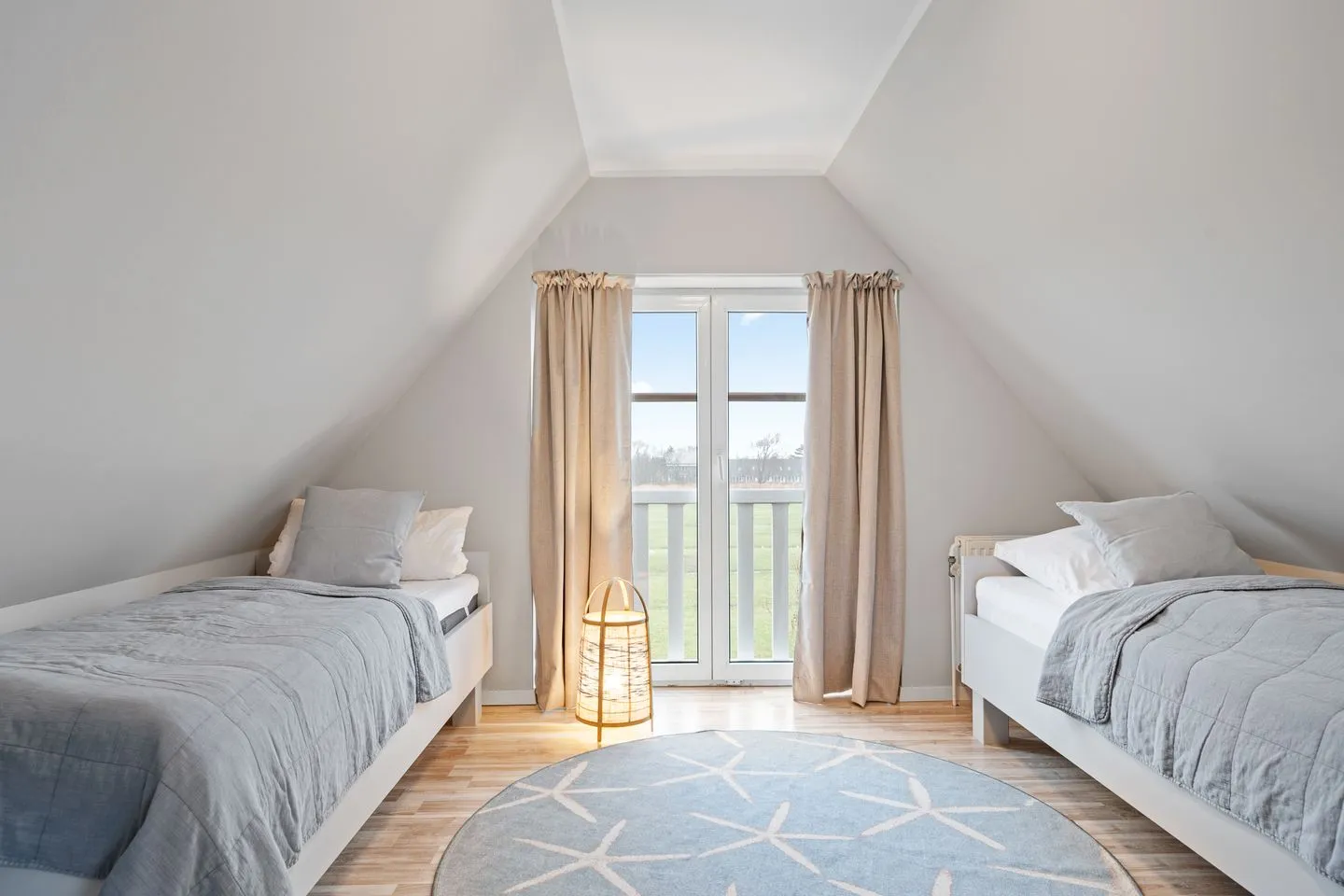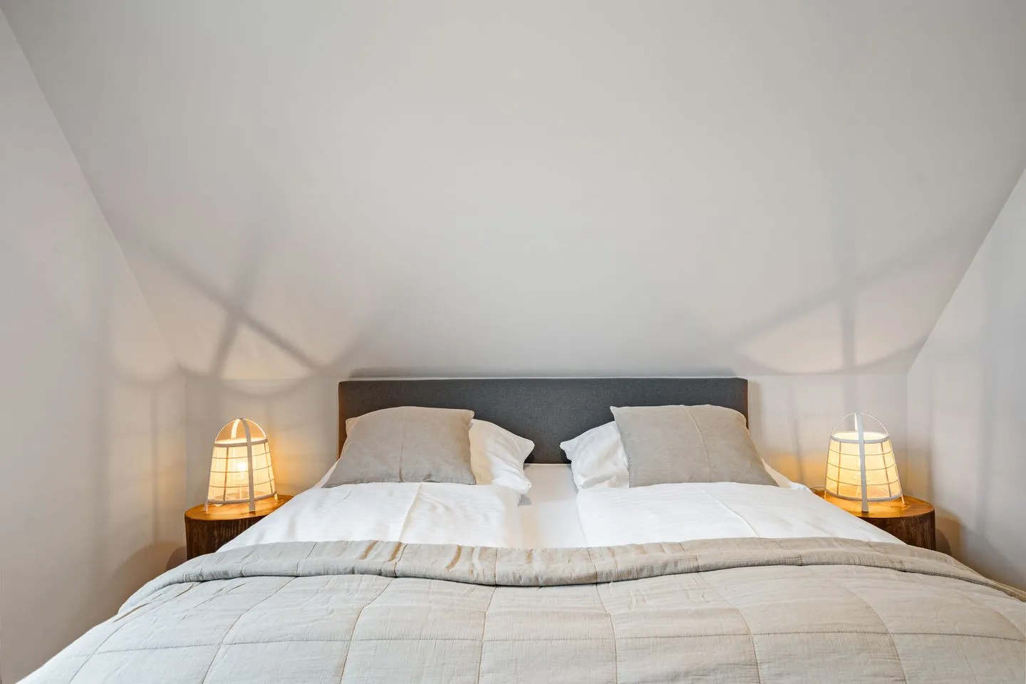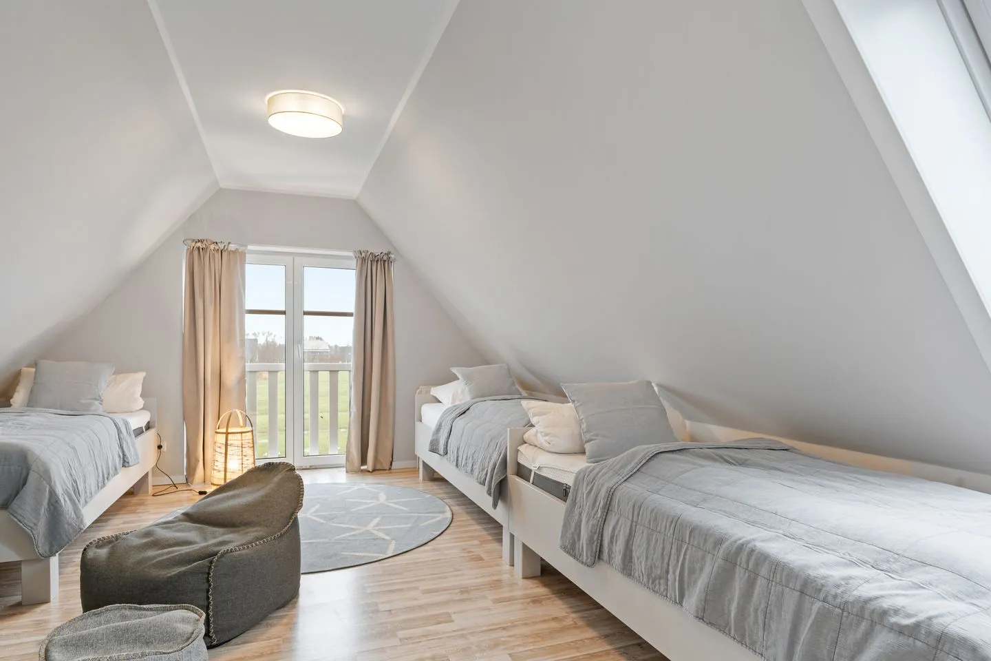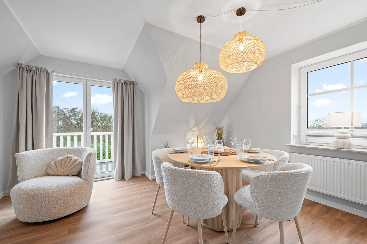 Im Obergeschoss über die breite Treppe erreichen Sie die 67 qm große Ferienwohnung "Waterkant SPO 4". Über den großzügigen Wohn-Essbereich gelangen Sie zum ausgebauten Spitzboden, der drei Betten und einen fantastischen Blick über Ording bis zum Westerhever-Leuchtturm bietet. Das Doppelschlafzimmer erreichen Sie vom großzügigen Flur und es bietet herrliche Ruhe.