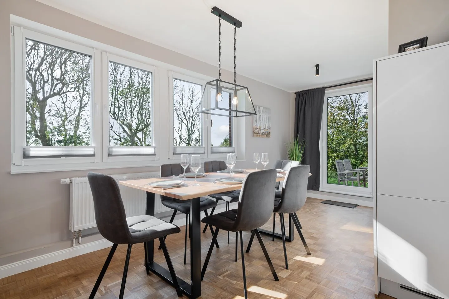 Die Ferienwohnung befindet sich im Erdgeschoss. Sie verfügt über ca. 70 m² Wohnfläche und ist wie folgt aufgeteilt: Im Erdgeschoss erwartet Sie ein geräumiger Wohnraum mit offener Küche und gemütlichem Essbereich. Die Küche ist voll ausgestattet. Ein Vollbad bietet allen Komfort. Vom Flur aus gelangen Sie in zwei großzügige Schlafzimmer eines mit einem Boxspringbett (1,8 x 2,0 m) und TV und eines mit einem Doppelbett (180x200). Ein weiteres Zimmer verfügt über eine Schlafcouch für die 5 Person.