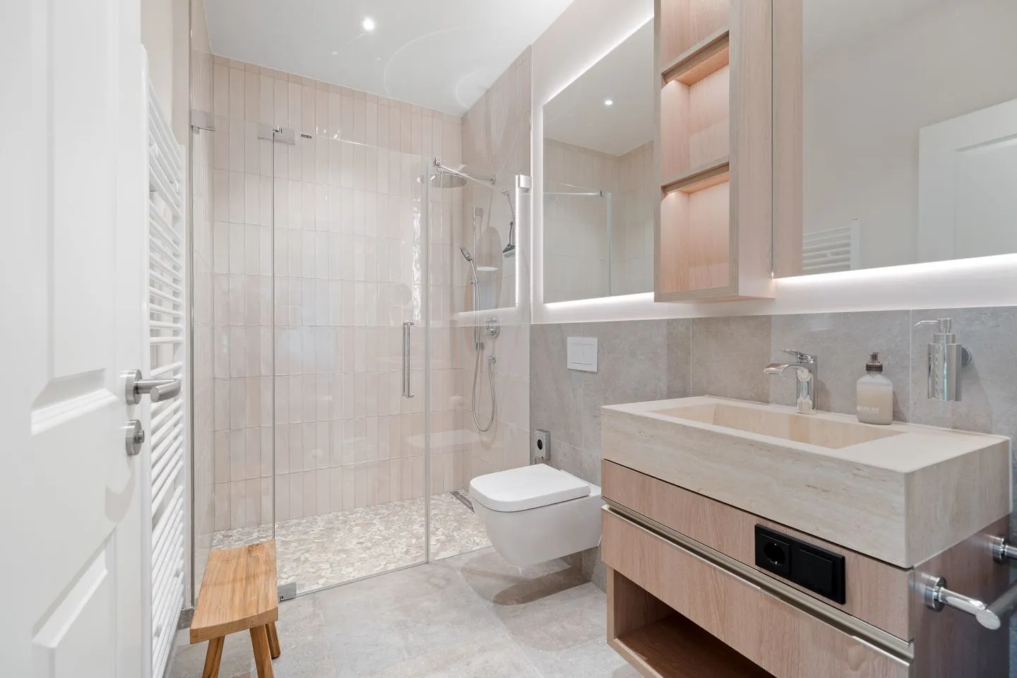 Ein Highlight dieses Domizil ist die großzügige Terrasse, die mit einem Sichtschutz ausgestattet ist, um Ihnen Privatsphäre und Ruhe zu bieten. Hier können Sie die frische Luft bei einem Glas Wein genießen oder einfach die Seele baumeln lassen. Der private Parkplatz ermöglicht eine sichere An- und Abreise. Zudem befindet sich auch ein gesondertes Fahrradhaus auf Gelände, um Ihre E-Bikes sicher zu verstauen.