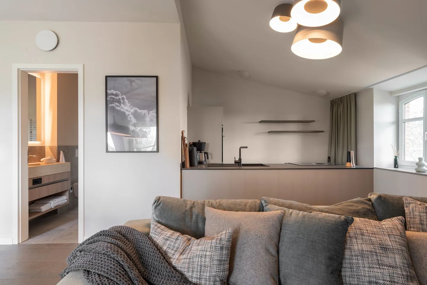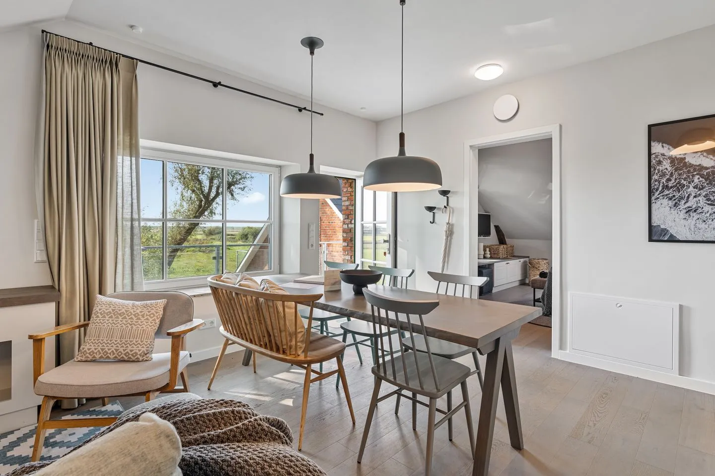 In der offenen und exklusiven Küche, die nahtlos in das Wohnzimmer übergeht - sind Sie bestens ausgestattet, um kulinarische Köstlichkeiten zuzubereiten. Die Küche ist mit hochwertigen E-Geräten ausgestattet, darunter ein Induktionsherd, ein Backofen, eine Spülmaschine, ein Kühlschrank mit Gefrierfach, sowie Mikrowelle, Toaster und Kaffeemaschine.