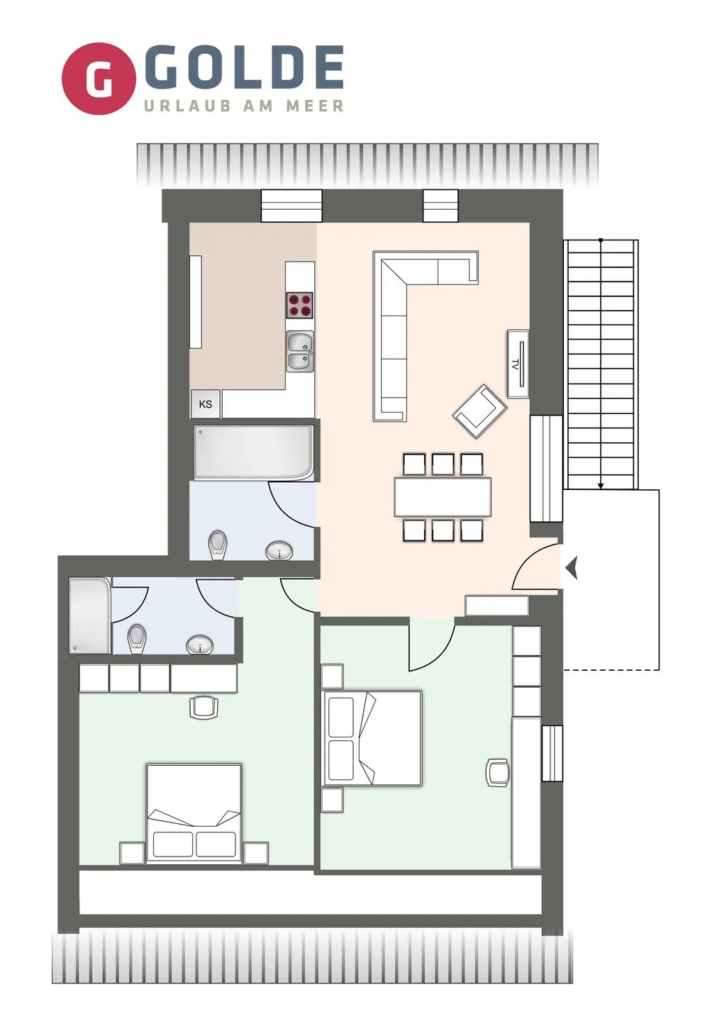 Zwei ruhige Schlafzimmer mit erstklassigen Boxspringbetten (1,80 x 2,00) bieten Rückzugsmöglichkeiten für erholsame Nächte.